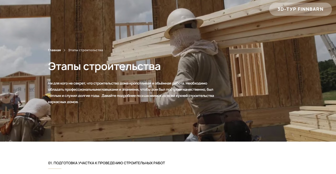 Сайт строителей домов в стиле барнхауз — FINNBARN. Проект предполагает использование нагруженных элементов: 3D-туров и сложных анимаций. Сделали так, чтобы сайт летал при интеграции множества элементов и анимации, а не лагал, как на большинстве других