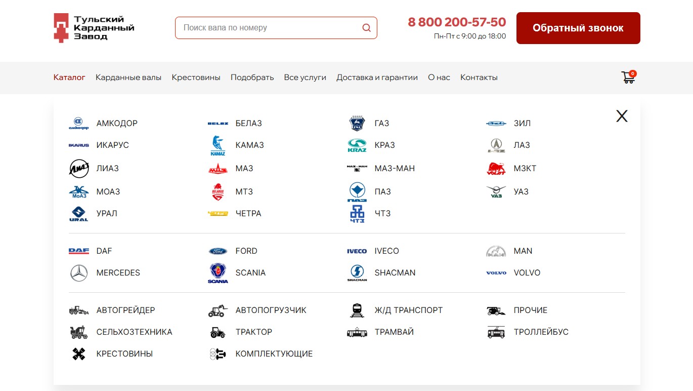 Наш проект — Тульский Карданный Завод. При разработке сделали комплекс работ для безболезненного расширения каталога интернет-магазина. Сайт отзывчив и не лагает, несмотря на тысячи номенклатур в ассортименте