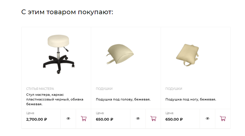 Блок “с этим часто покупают” или “аналогичный товар” - блок, которым часто пренебрегают некомпетентные специалисты, а ведь он существенно увеличивает средний чек” В нашем случае здесь также настроен фильтр соответствия. То есть, если пользователь просматривает бежевое кресло, то ему будет предлагаться купить к нему только бежевый стул и только бежевую подушку.