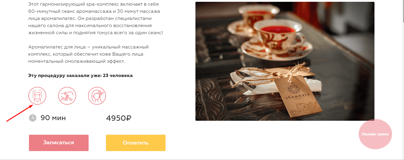 В каждой вкладке реализованы дополнительные иконки с пояснениями. Указаны длительность процедуры и ее стоимость. Здесь же можно записаться или оплатить услугу сразу.