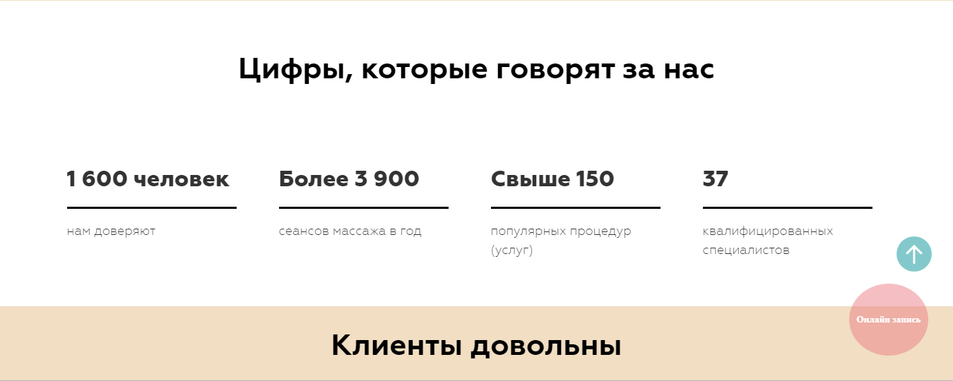 - Блок с цифрами - социальное доказательство: на основе статистики посещений/оказанных услуг, мы вывели цифры, которые дополнительно «подогревают» на покупку услуг.