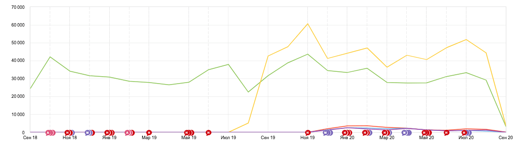 В августе 2019 г. программистом заказчика, увы, были допущены ошибки в настройке основной версии сайта, в результате чего в индекс и как следствие, в выдачу, попало огромное количество дублей страниц товаров, что привело падению посещаемости по SEO. Обычно внедрением программных доработок занимается наша команда, но в этом случае заказчик работал со своим штатным программистом. Ошибка была быстро исправлена, и в сентябре позиция сайта в выдаче вернулась на место, а в октябре мы пробили планку по посещаемости.