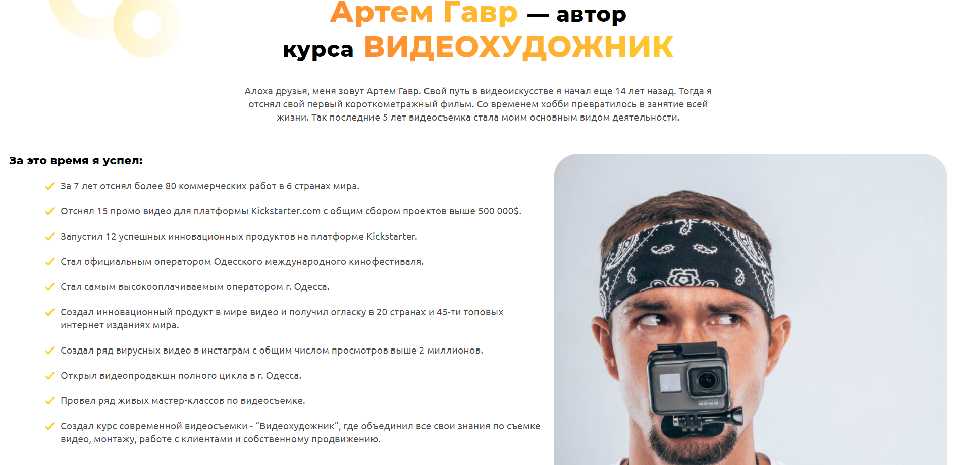 Кроме этого, на сайте добавлено 2-х минутное видео с преподавателем, в котором он подробно рассказывает о содержании занятий, указывает на ценность уроков, мотивирует дополнительными бонусами. Качество света, композиции, примеры его работы – всё на высоком уровне.