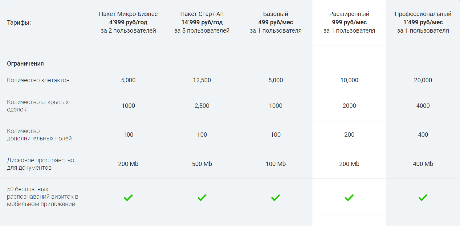 amoCRM – платная система. Сколько стоит? Ценник начинается от 499 рублей в месяц за 1-го пользователя. Чем выше цена тарифа – тем больше функционал.