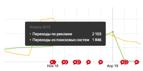 Мы просмотрели графики за прошлые периоды и выявили накрутку поведенческих факторов прошлым специалистом. Наиболее заметный и неестественный скачок трафика произошел в октябре 2018 года, в несезон.