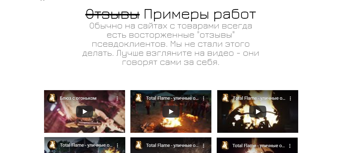 Блок с отзывами заполнен не просто отзывами, а видео с реальными примерами использования очагов. Нет ничего лучше, как показать товар в деле. В данном случае закрываются вопросы реальных, а не «фейковых» отзывов.