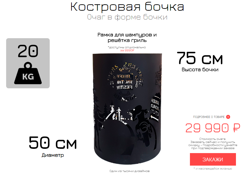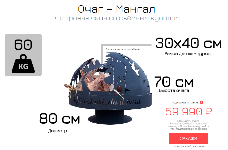 Так как основная задача этого лендинга заключалась в продаже продукции, то на следующих блоках мы показали товар лицом – как выглядят сами очаги. И здесь же указали параметры товара: размеры, вес, варианты дизайна, стоимость, подчеркивая, что каждый очаг индивидуален и может быть сделан под запросы клиента.