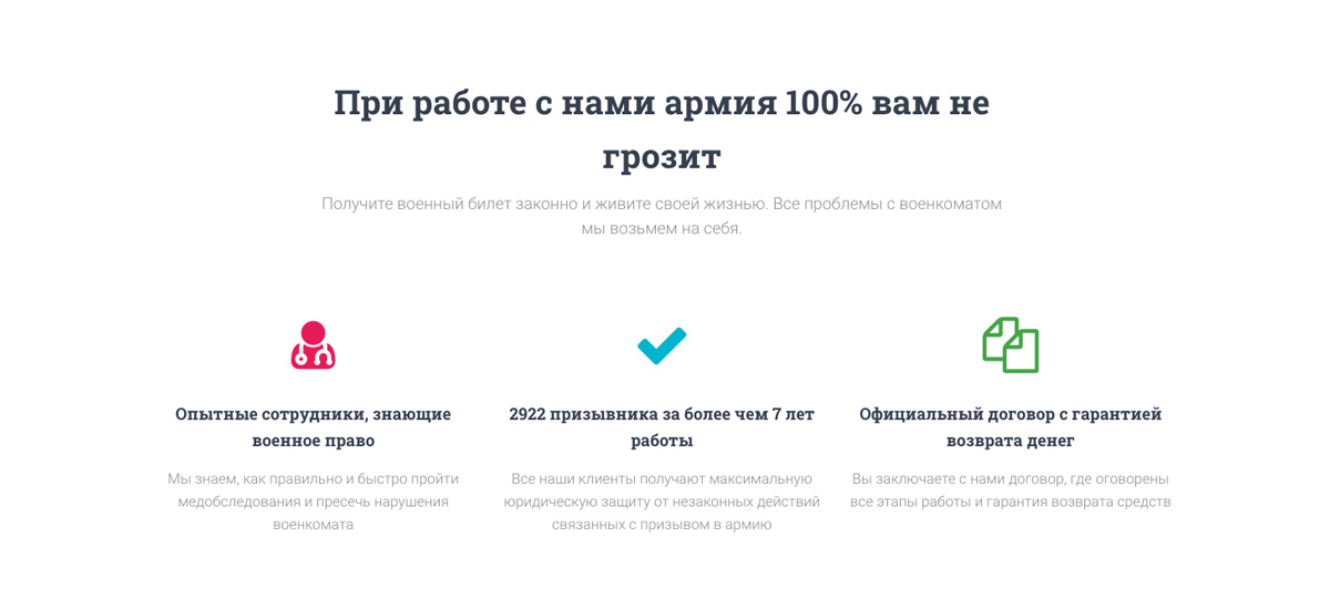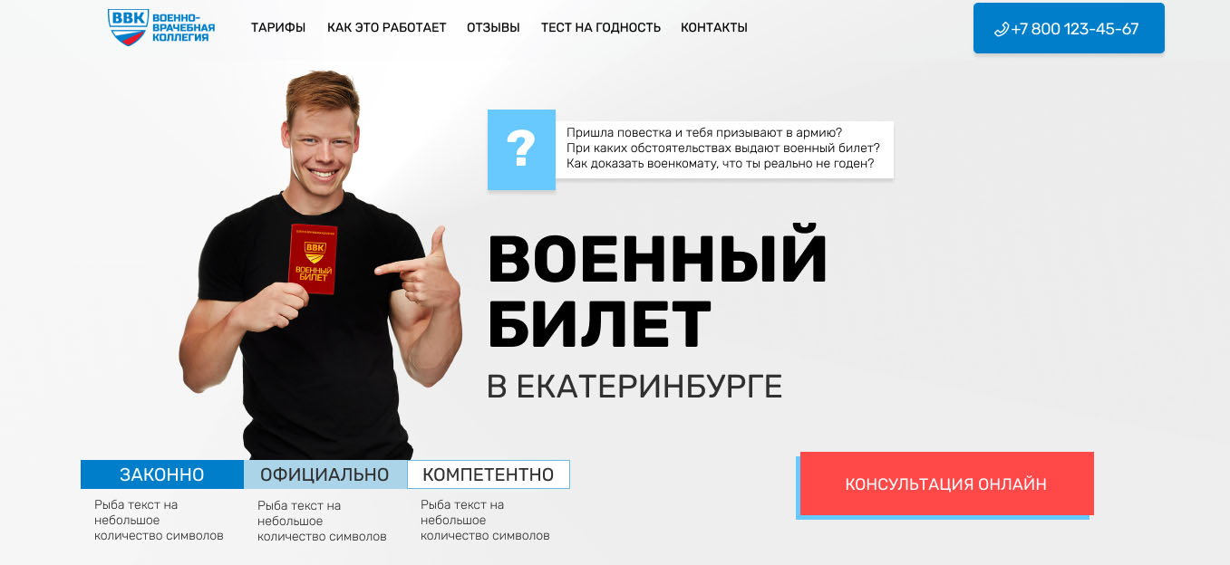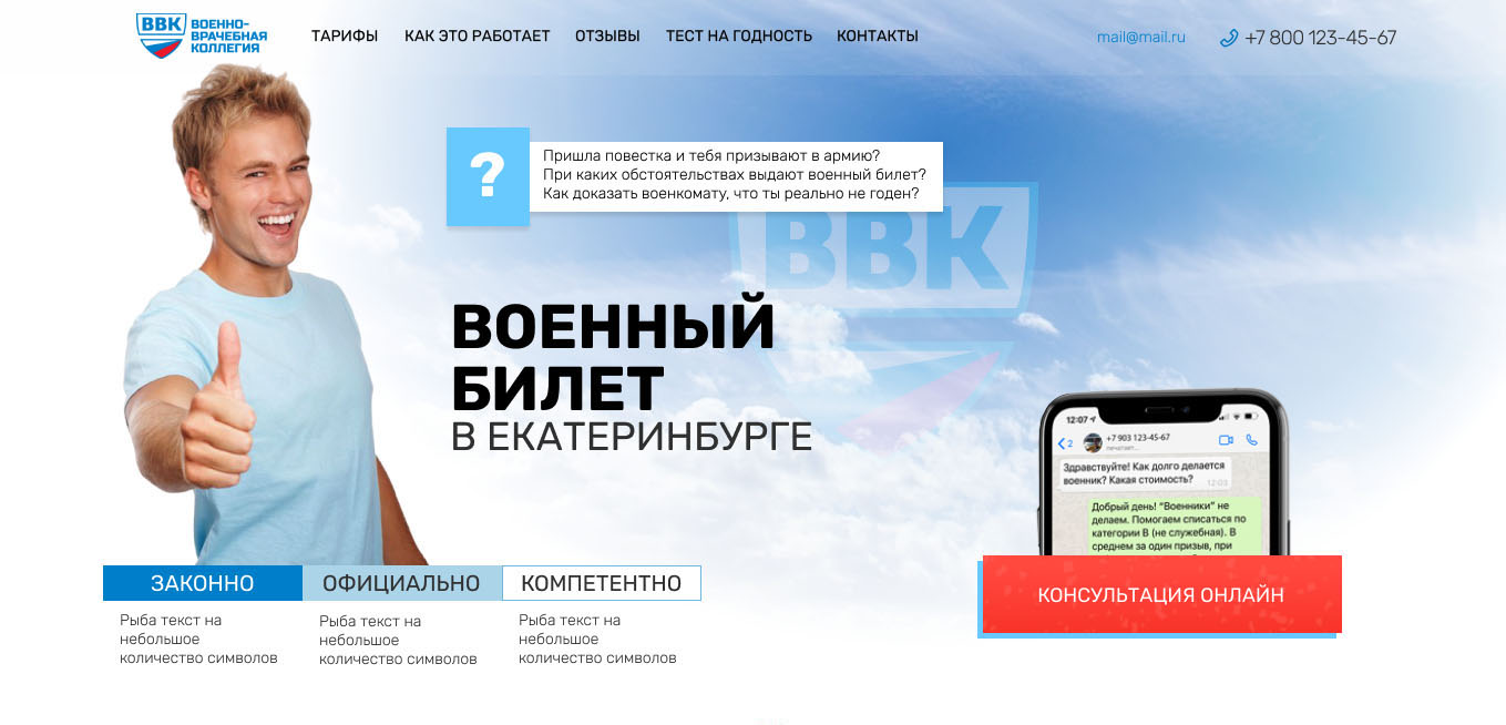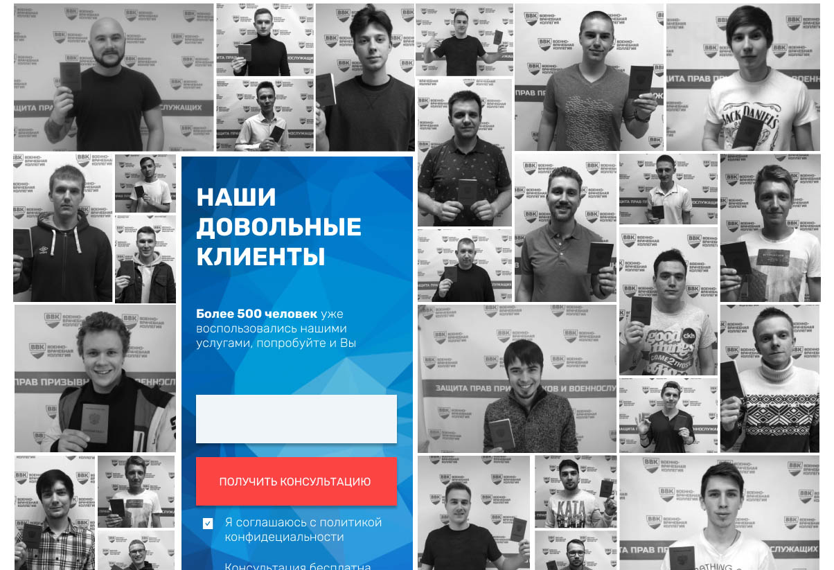 Так к нам обратилась компания «Военно-врачебная коллегия», освобождающая призывников от службы в армии абсолютно законно. Текущий сайт компании оставлял желать лучшего и не раскрывал особенностей компании, а новый сайт, который им делали другие рекламщики - как говорится, "не зашел". Мы взяли этот проект на субподряд и успешно его выполнили. Что из этого получилось - читайте далее.