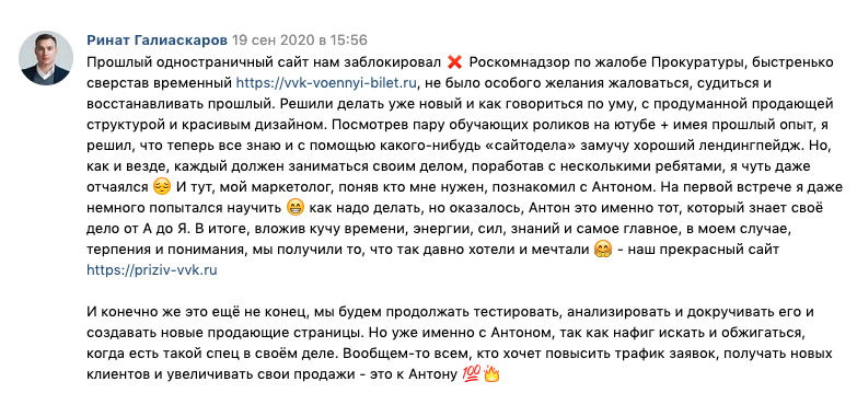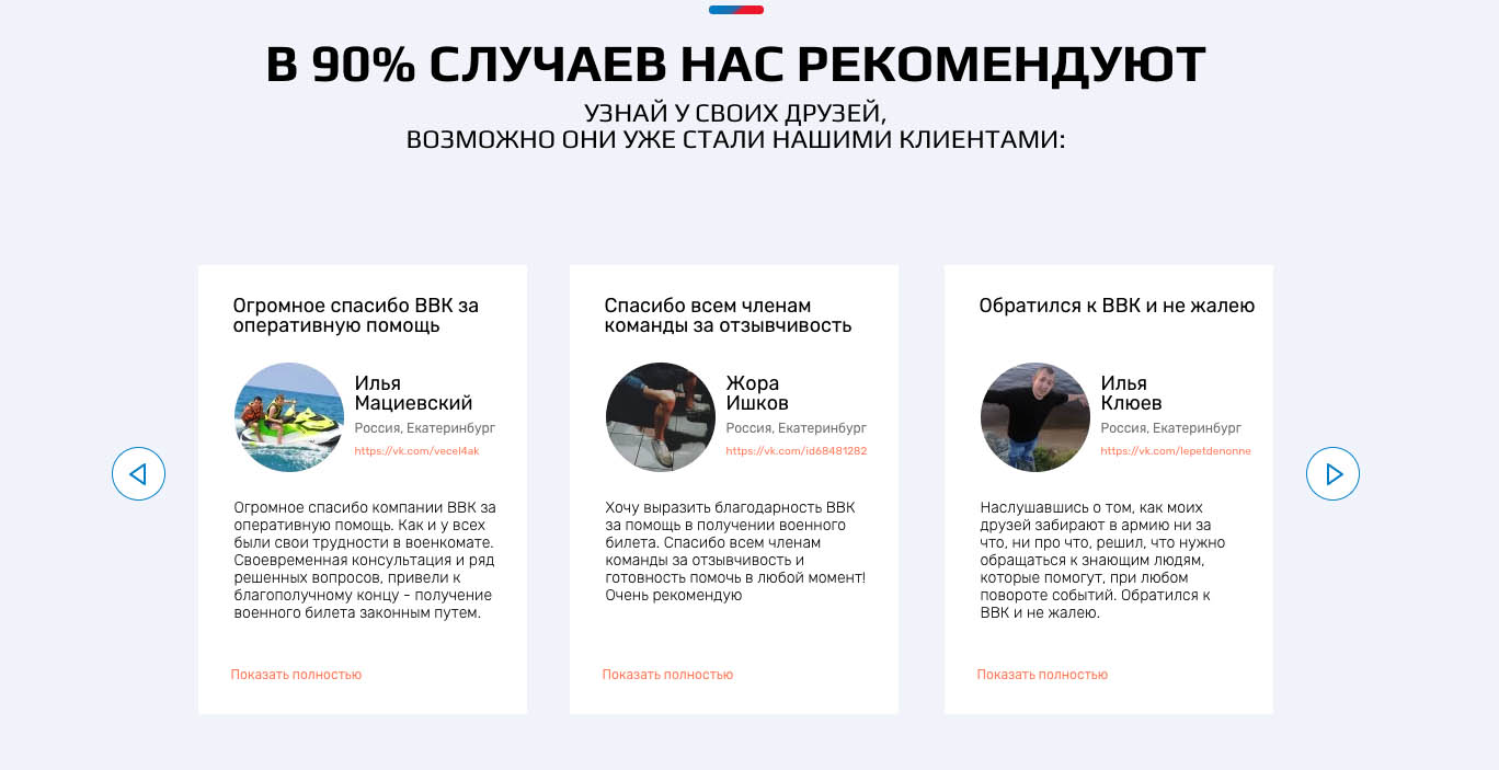 Отзывы с указанием профилей людей в соцсетях - мощный инструмент. Во-первых, полностью отпадают сомнения в реальности отзывов. Во-вторых, потенциальный клиент может связаться с тем, кому компания уже помогла и уточнить свои вопросы. Живые настоящие клиенты вызывают мощное доверие.
