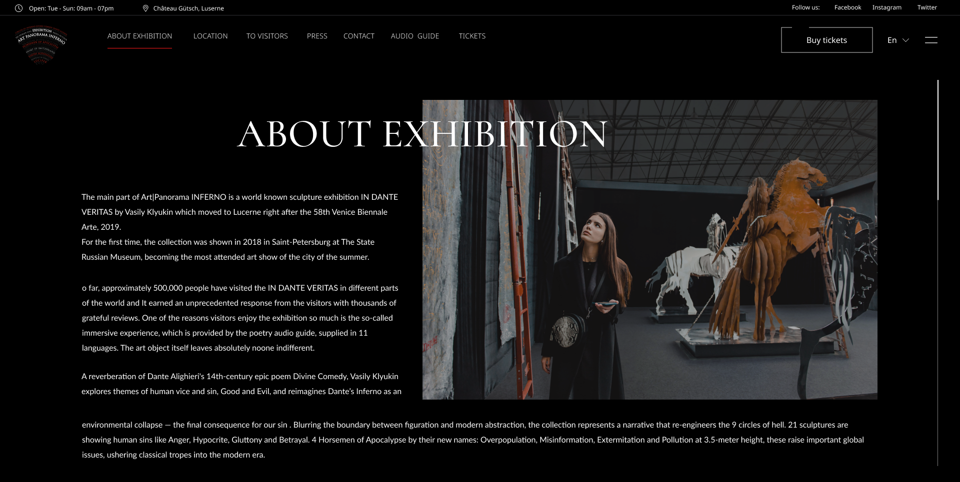 Основатель выставки - Василий Клюкин, успешный банкир в прошлом, а ныне, не менее успешный архитектор, писатель и скульптор. В 2019 году на международной Биеннале в Венеции Василий представил свою выставку, около 30 фигур: всадники апокалипсиса, посмертная маска Данте, 21 фигура человеческих пороков.