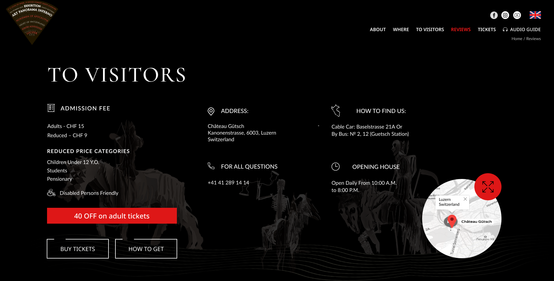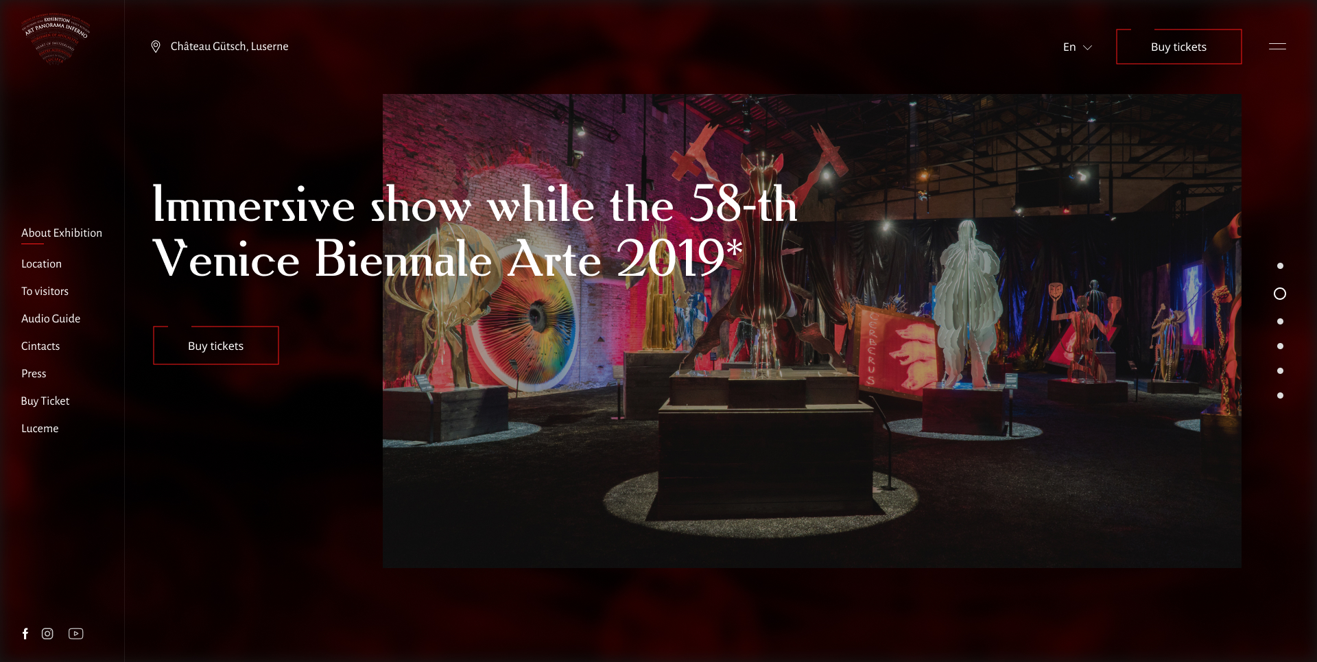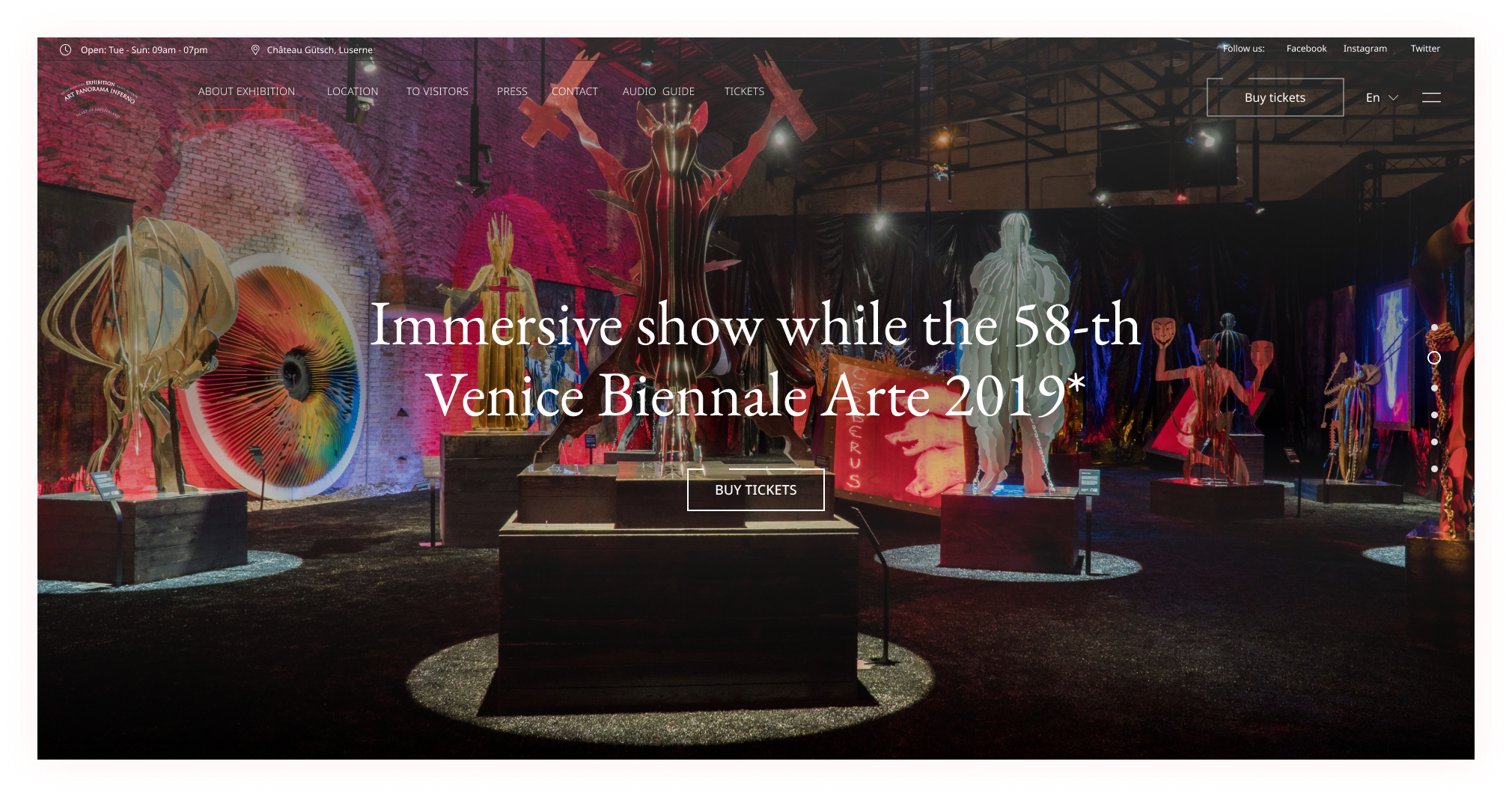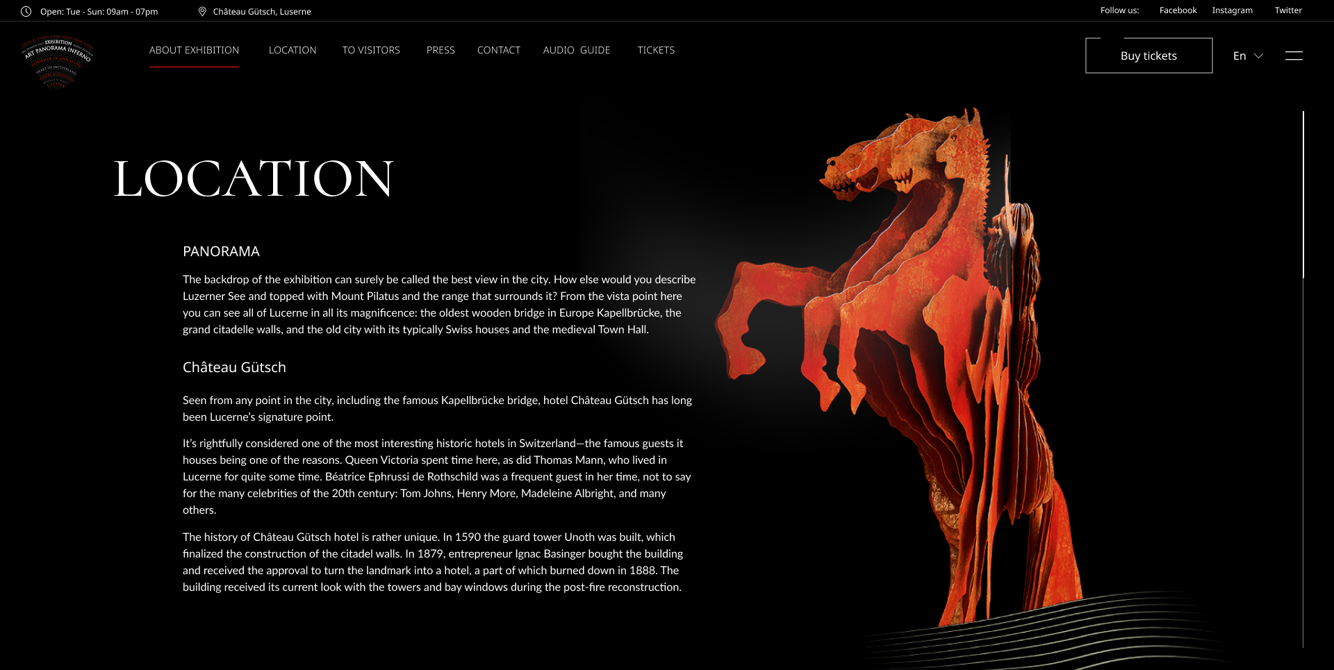 Главное меню навигации располагалось слева, а кнопка действия (CTA) «покупки билета» находилась ближе к правой части экрана. Для заголовков были подобраны шрифты в стиле антиква, для создания соответствующей атмосферы.