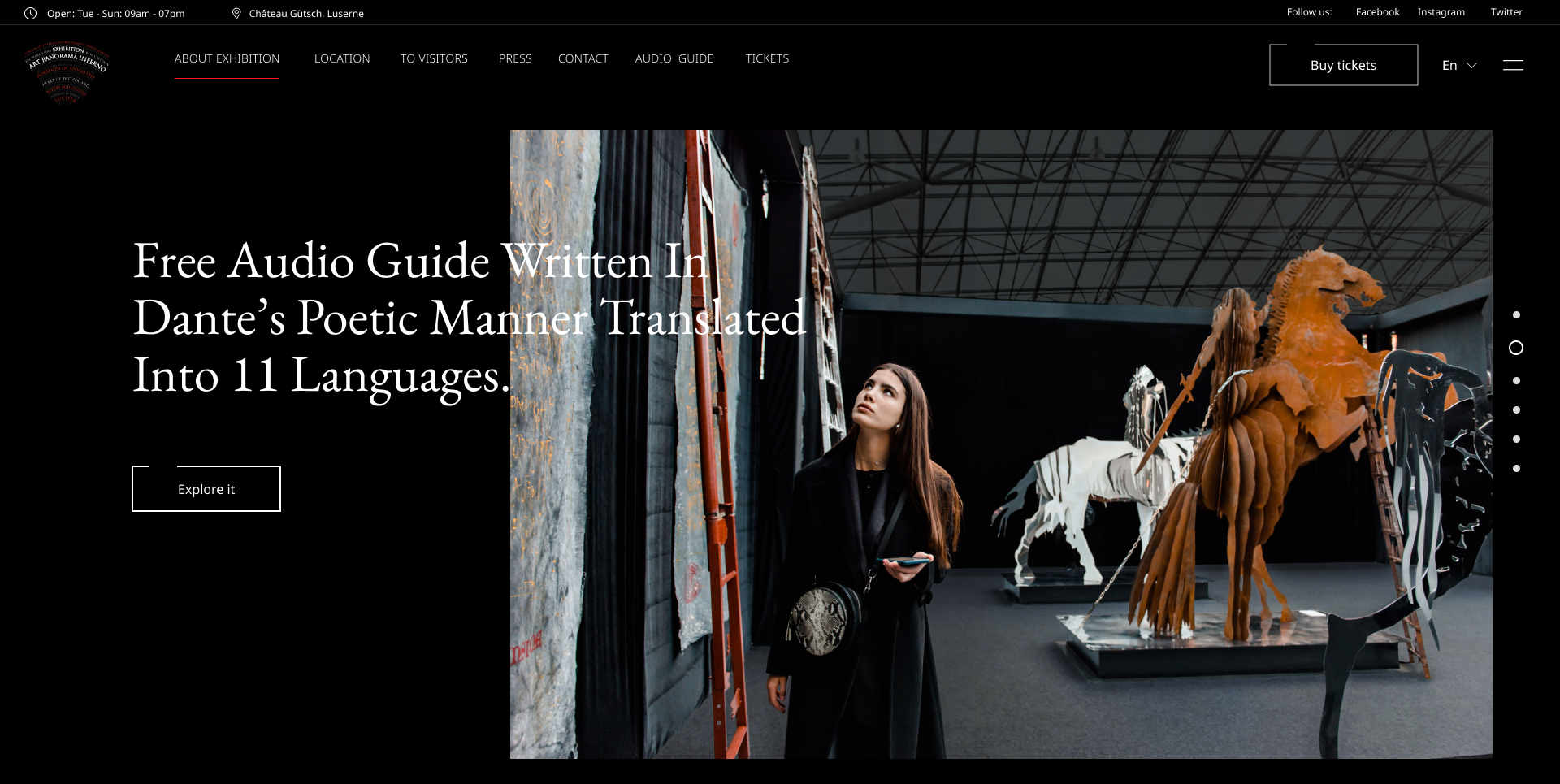 Особенность сайта – наличие модуля аудиогида. Для каждой скульптуры записано описание-пояснение на 11 языках. Проходя по выставке, посетитель может зайти на сайт, выбрать соответствующий пункт меню и прослушать аудиосопровождение выставки, тем самым не нуждаясь в сопровождении экскурсовода.