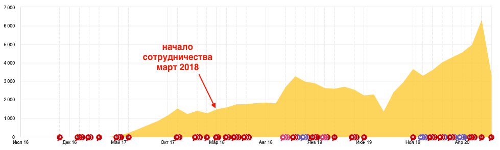 Перед стартом нашего сотрудничества количество заходов в месяц на сайт долго находилось на уровне 1 800 чел/мес и не сдвигалось с места, а деньги расходовались в пустую.