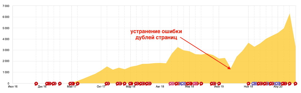 В августе 2019 г. программистом заказчика, увы, были допущены ошибки в настройке основной версии сайта, в результате чего в индекс и как следствие, в выдачу, попало огромное количество дублей страниц товаров, что привело падению посещаемости по SEO. Обычно внедрением программных доработок занимается наша команда, но в этом случае заказчик работал со своим штатным программистом. Ошибка была быстро исправлена, и в сентябре позиция сайта в выдаче вернулась на место, а в октябре мы пробили планку по посещаемости.