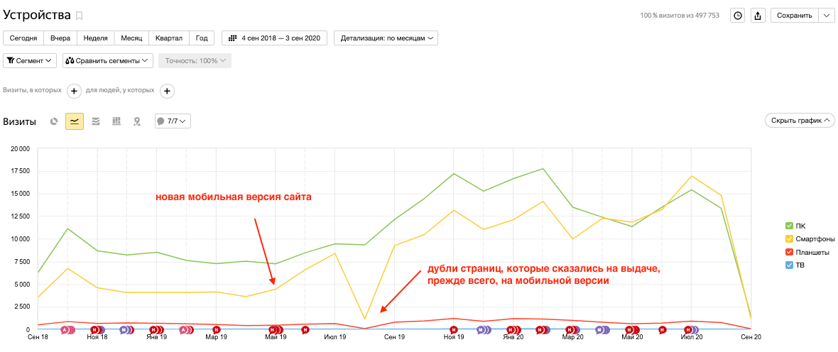 На графике наглядно видно, как создание новой мобильной версии положительно сказалось на посещаемости сайта: