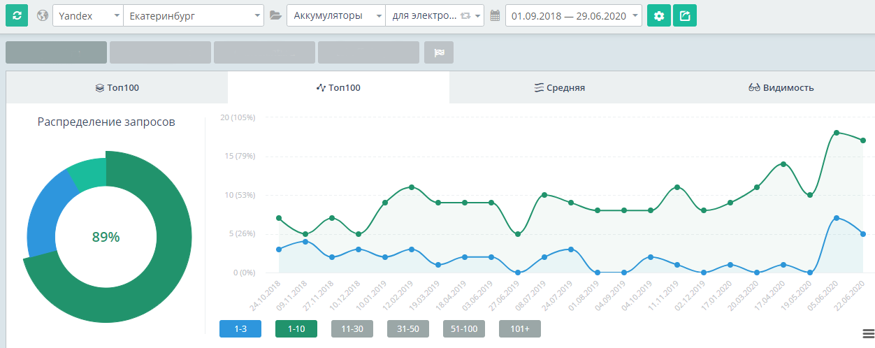 89% ключей, связанных с аккмуляторами, находятся в ТОП-10, то есть на первой странице поисковика: