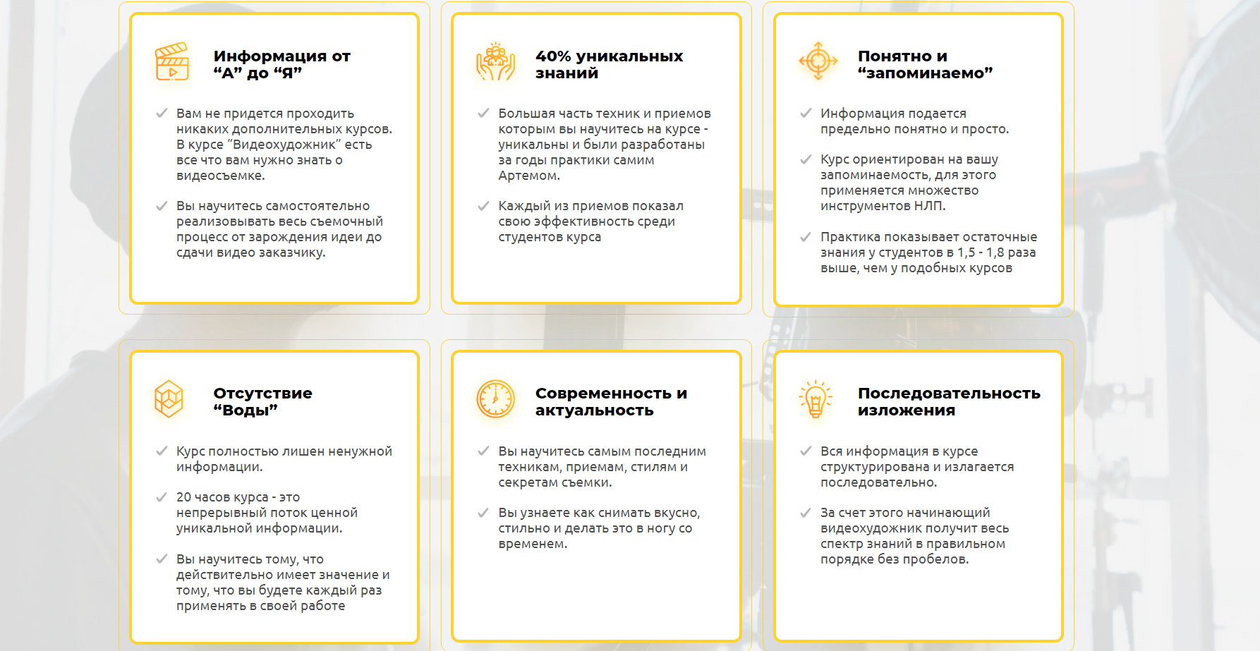 Кроме этого, на сайте добавлено 2-х минутное видео с преподавателем, в котором он подробно рассказывает о содержании занятий, указывает на ценность уроков, мотивирует дополнительными бонусами. Качество света, композиции, примеры его работы – всё на высоком уровне.